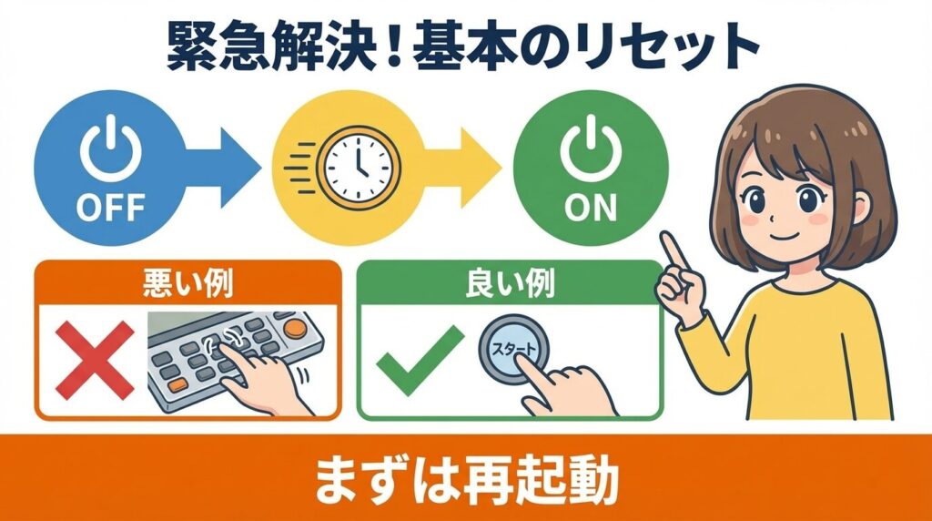 「じゃあ、この溜まった水はどうすればいいの?」と途方に暮れてしまうかもしれませんが、諦めるのはまだ早いです。緊急時に試すべき「擬似的な強制排水」やリセットの手順があります。軽いプログラムエラーや一時的なセンサー誤検知であれば、以下の手順を踏むことでポンプが再起動し、溜まっていた水が排出されることがあります。