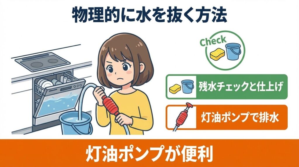 - 電気的に動かない場合は、灯油ポンプやスポンジで物理的に水を抜くのが一番早い。