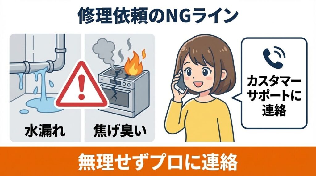いろいろ試したけれど解決しない。これ以上素人が触って壊すのも怖い。そんな時は、プロに任せる勇気も必要です。無駄な時間を過ごさないためにも、以下の症状があれば「自力解決は不可(部品交換が必要)」と判断し、速やかにメーカーへ連絡してください。