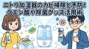 もし、重曹だけでは落ちない頑固なカビ汚れや、より徹底的に除菌をしたい場合は、アルコール製剤や専用の除菌グッズを併用するのも一つの手です。以下の記事では、実際にニトリの加湿器を使ってカビ掃除を行った詳細なレポートや、予防のための裏技が紹介されています。ぜひ参考にしてみてください。