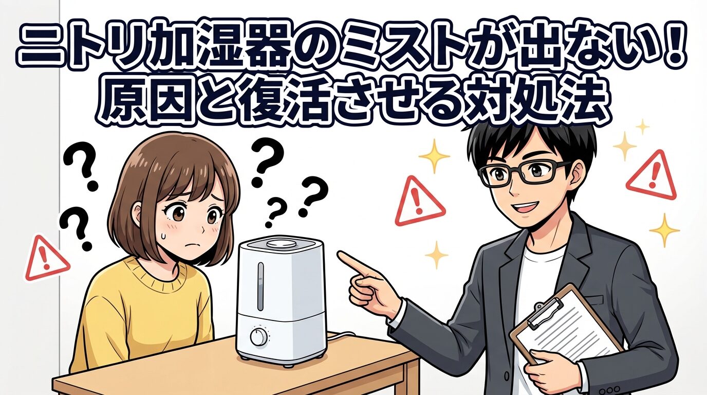 説明書を探して読むのも面倒ですし、かといって修理に出すほど高価な家電でもないので、新しいものに買い替えようか悩んでいる方も多いのではないでしょうか。でも、ちょっと待ってください。実は、ニトリの超音波式加湿器によくある「ミストが出ない」というトラブルの多くは、致命的な故障ではなく、ご自宅にある綿棒やクエン酸を使ったちょっとしたお手入れや、意外と知らない部品の確認だけで、嘘のように復活することがあるんです。
