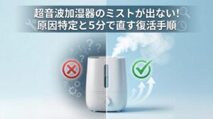 ニトリで人気の可愛らしい卓上加湿器や、USBタイプの超音波式加湿器を使っていると、昨日までは元気に動いていたのに急に蒸気が出なくなったり、スイッチを入れても「プスン」といってすぐに止まってしまったりすることがあります。「安かったから壊れやすいのかな?」と諦める前に、まずは基本的なチェックポイントを確認してみましょう。