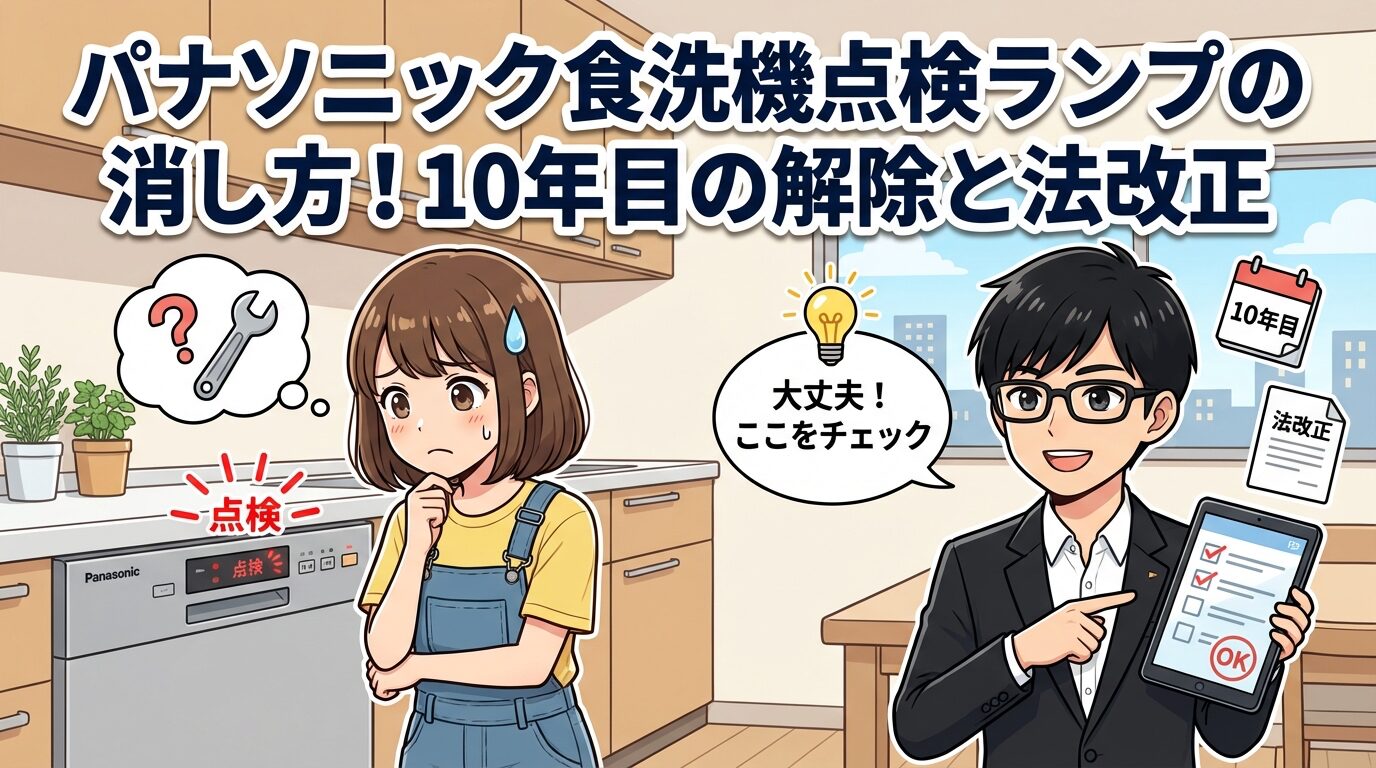 実はパナソニック製のビルトイン食洗機には、使い始めてから約10年が経過すると自動的にお知らせする機能がついています。「点検ランプを消したい」と思って説明書を見ても消し方が載っておらず、ネットで調べて「リセットボタンが見当たらない」と困っている方も多いようです。さらに、メーカーに点検を依頼すると費用がかかると聞いて、「自分でなんとかできないか」と検索されているのではないでしょうか。