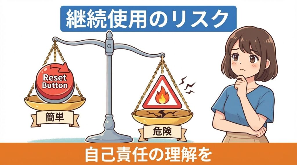 ここまでリセット方法をお伝えしてきましたが、ここからは「リセットした後」のお話です。「ランプが消えたから新品同様!」というわけではありません。10年使った機械を安全に使い続けるために、知っておいていただきたいリスクと対策についてお話しします。