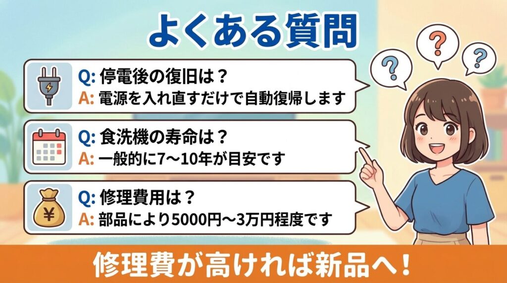 ここが大きな分かれ目です。食洗機(特にビルトイン)の耐用年数は約10年ですが、7年を超えると、一箇所直してもすぐに別の箇所(ポンプ、ヒーター、制御基板など)が壊れる「連鎖故障」のリスクが急激に高まります。「今回3万円かけて修理したのに、半年後にまた4万円かかった」という事態になりかねません。 - 修理見積もりが3万円以上: