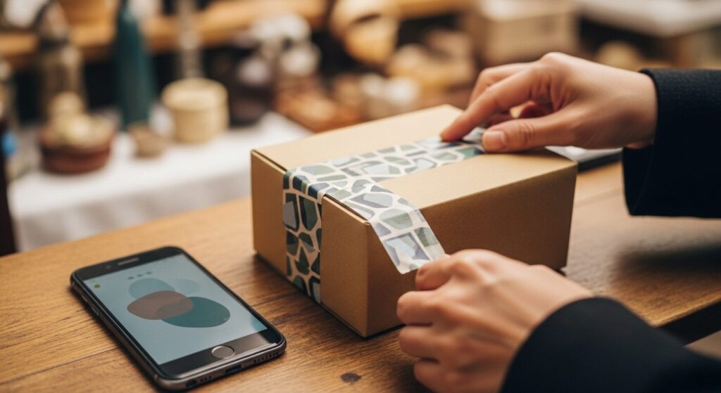 これはもう「デザイン養生テープ」の独壇場かもしれません。先ほど紹介した「Thank you」柄などで梱包の仕上げをすると、ただのガムテープで留めるより、購入者さんに感謝の意と「この人、丁寧だな」という良い印象を与えられます。